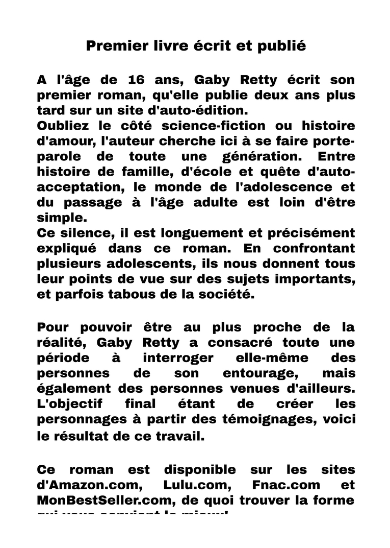 A l'âge de 16 ans, Gaby Retty écrit son premier roman, qu'elle publie deux ans plus tard sur un site d'auto-édition. Oubliez le côté science-fiction ou histoire d'amour, l'auteur cherche ici à se faire porte-parole de toute une génération. Entre histoire de famille, d'école et quête d'auto-acceptation, le monde de l'adolescence et du passage à l'âge adulte est loin d'être simple. Ce silence, il est longuement et précisément expliqué dans ce roman. En confrontant plusieurs adolescents, ils nous donnent tous leur points de vue sur des sujets importants, et parfois tabous de la société. Pour pouvoir être au plus proche de la réalité, Gaby Retty a consacré toute une période à interroger elle-même des personnes de son entourage, mais également des personnes venues d'ailleurs. L'objectif final étant de créer les personnages à partir des témoignages, voici le résultat de ce travail. Ce roman est disponible sur les sites d'Amazon.com, Lulu.com, Fnac.com et MonBestSeller.com, de quoi trouver la forme qui vous convient le mieux!