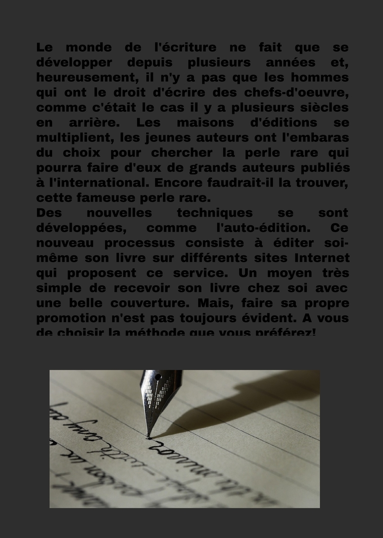 Le monde de l'écriture ne fait que se développer depuis plusieurs années et, heureusement, il n'y a pas que les hommes qui ont le droit d'écrire des chefs-d'oeuvre, comme c'était le cas il y a plusieurs siècles en arrière. Les maisons d'éditions se multiplient, les jeunes auteurs ont l'embaras du choix pour chercher la perle rare qui pourra faire d'eux de grands auteurs publiés à l'international. Encore faudrait-il la trouver, cette fameuse perle rare. Des nouvelles techniques se sont développées, comme l'auto-édition. Ce nouveau processus consiste à éditer soi-même son livre sur différents sites Internet qui proposent ce service. Un moyen très simple de recevoir son livre chez soi avec une belle couverture. Mais, faire sa propre promotion n'est pas toujours évident. A vous de choisir la méthode que vous préférez!