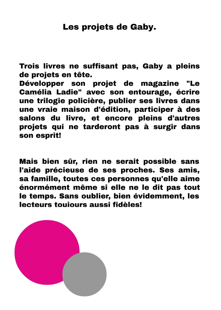 Trois livres ne suffisant pas, Gaby a pleins de projets en tête. Développer son projet de magazine "Le Camélia Ladie" avec son entourage, écrire une trilogie policière, publier ses livres dans une vraie maison d'édition, participer à des salons du livre, et encore pleins d'autres projets qui ne tarderont pas à surgir dans son esprit! Mais bien sûr, rien ne serait possible sans l'aide précieuse de ses proches. Ses amis, sa famille, toutes ces personnes qu'elle aime énormément même si elle ne le dit pas tout le temps. Sans oublier, bien évidemment, les lecteurs toujours aussi fidèles!