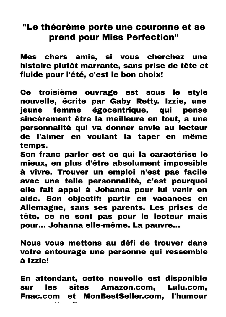 Mes chers amis, si vous cherchez une histoire plutôt marrante, sans prise de tête et fluide pour l'été, c'est le bon choix! Ce troisième ouvrage est sous le style nouvelle, écrite par Gaby Retty. Izzie, une jeune femme égocentrique, qui pense sincèrement être la meilleure en tout, a une personnalité qui va donner envie au lecteur de l'aimer en voulant la taper en même temps. Son franc parler est ce qui la caractérise le mieux, en plus d'être absolument impossible à vivre. Trouver un emploi n'est pas facile avec une telle personnalité, c'est pourquoi elle fait appel à Johanna pour lui venir en aide. Son objectif: partir en vacances en Allemagne, sans ses parents. Les prises de tête, ce ne sont pas pour le lecteur mais pour... Johanna elle-même. La pauvre... Nous vous mettons au défi de trouver dans votre entourage une personne qui ressemble à Izzie! En attendant, cette nouvelle est disponible sur les sites Amazon.com, Lulu.com, Fnac.com et MonBestSeller.com, l'humour vous y attend!