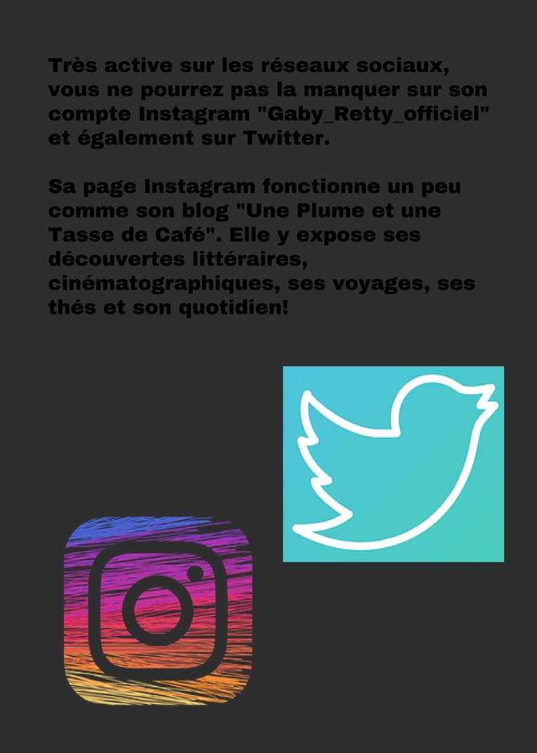 Très active sur les réseaux sociaux, vous ne pourrez pas la manquer sur son compte Instagram "Gaby_Retty_officiel" et également sur Twitter. Sa page Instagram fonctionne un peu comme son blog "Une Plume et une Tasse de Café". Elle y expose ses découvertes littéraires, cinématographiques, ses voyages, ses thés et son quotidien!