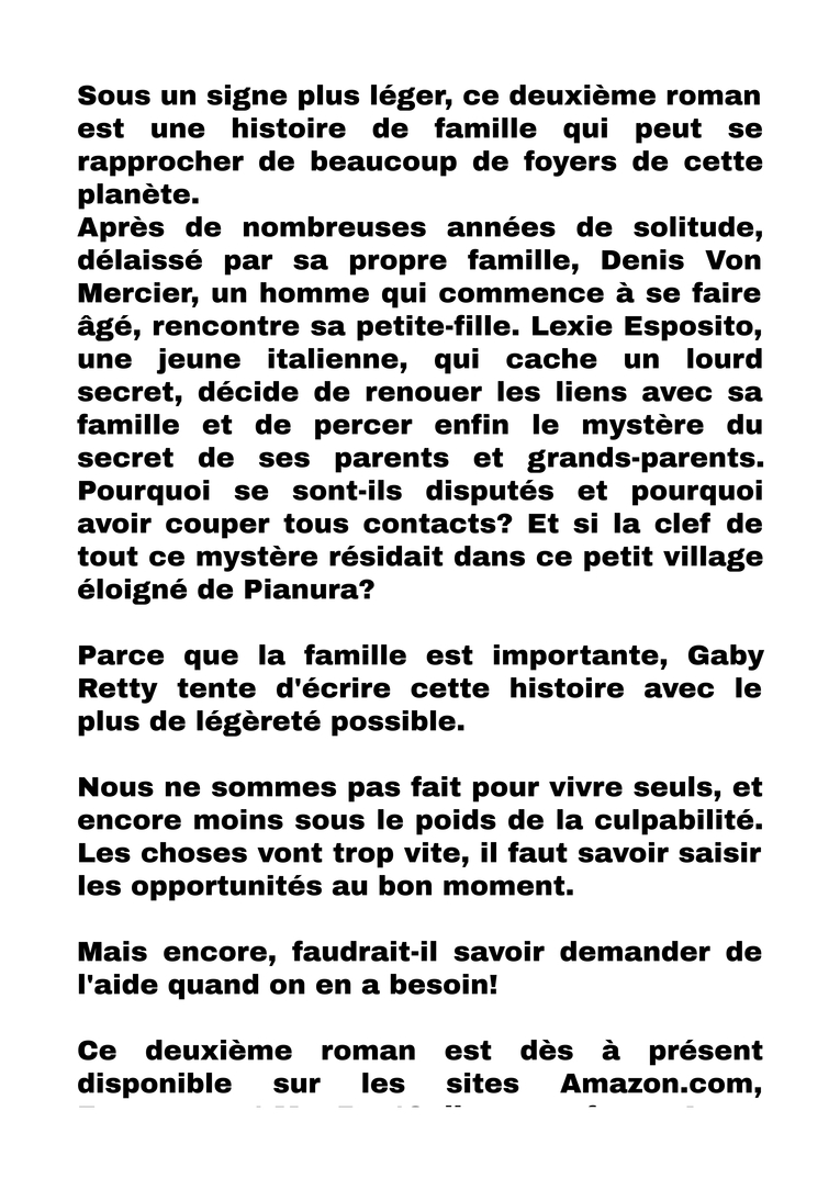 Sous un signe plus léger, ce deuxième roman est une histoire de famille qui peut se rapprocher de beaucoup de foyers de cette planète. Après de nombreuses années de solitude, délaissé par sa propre famille, Denis Von Mercier, un homme qui commence à se faire âgé, rencontre sa petite-fille. Lexie Esposito, une jeune italienne, qui cache un lourd secret, décide de renouer les liens avec sa famille et de percer enfin le mystère du secret de ses parents et grands-parents. Pourquoi se sont-ils disputés et pourquoi avoir couper tous contacts? Et si la clef de tout ce mystère résidait dans ce petit village éloigné de Pianura? Parce que la famille est importante, Gaby Retty tente d'écrire cette histoire avec le plus de légèreté possible. Nous ne sommes pas fait pour vivre seuls, et encore moins sous le poids de la culpabilité. Les choses vont trop vite, il faut savoir saisir les opportunités au bon moment. Mais encore, faudrait-il savoir demander de l'aide quand on en a besoin! Ce deuxième roman est dès à présent disponible sur les sites Amazon.com, Fnac.com et MonBestSeller.com, foncez!