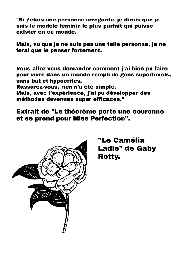 "Si j’étais une personne arrogante, je dirais que je suis le modèle féminin le plus parfait qui puisse exister en ce monde. Mais, vu que je ne suis pas une telle personne, je ne ferai que le penser fortement. Vous allez vous demander comment j’ai bien pu faire pour vivre dans un monde rempli de gens superficiels, sans but et hypocrites. Rassurez-vous, rien n’a été simple. Mais, avec l’expérience, j’ai pu développer des méthodes devenues super efficaces."Extrait de "Le théorème porte une couronne et se prend pour Miss Perfection".