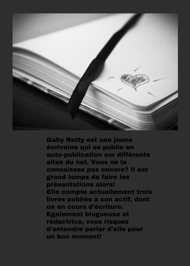 Gaby Retty est une jeune écrivaine qui se publie en auto-publication sur différents sites du net. Vous ne la connaissez pas encore? Il est grand temps de faire les présentations alors! Elle compte actuellement trois livres publiés à son actif, dont un en cours d'écriture. Egalement blogueuse et rédactrice, vous risquez d'entendre parler d'elle pour un bon moment!
