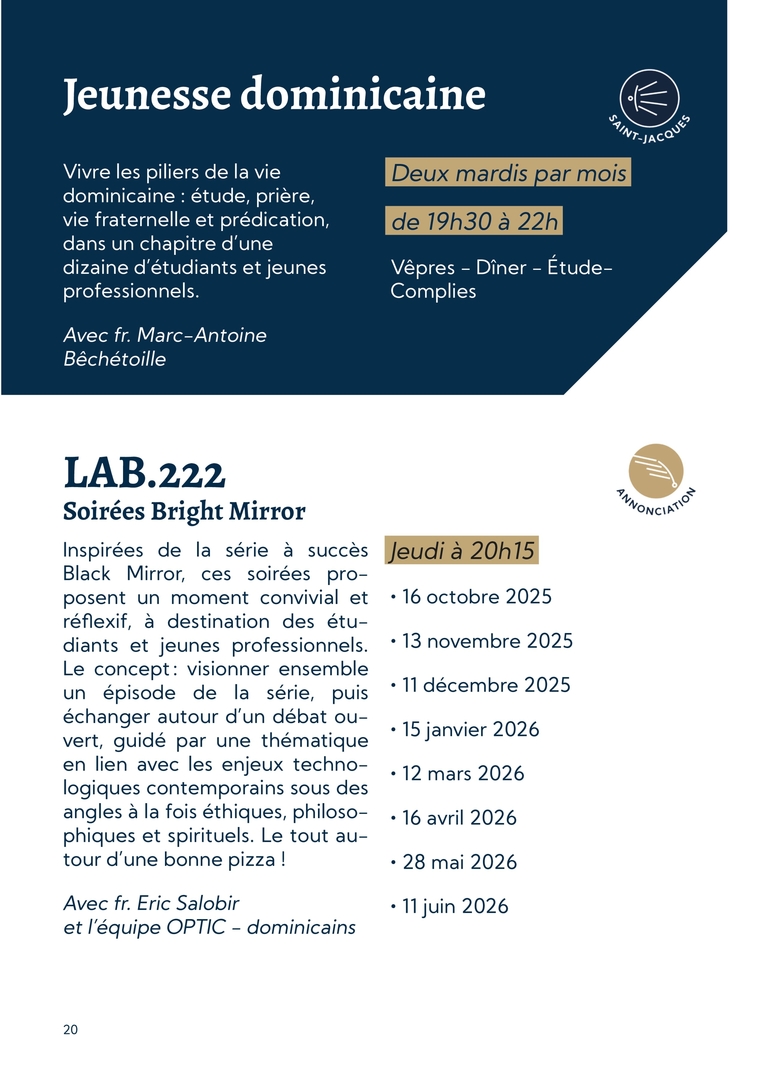 20Jeunesse dominicaineLAB.222Soirées Bright MirrorVivre les piliers de la vie dominicaine : étude, prière, vie fraternelle et prédication, dans un chapitre d’une dizaine d’étudiants et jeunes professionnels.Avec fr. Marc-Antoine BêchétoilleInspirées de la série à succès Black Mirror, ces soirées pro-posent un moment convivial et réflexif, à destination des étu-diants et jeunes professionnels. Le concept : visionner ensemble un épisode de la série, puis échanger autour d’un débat ou-vert, guidé par une thématique en lien avec les enjeux techno-logiques contemporains sous des angles à la fois éthiques, philoso-phiques et spirituels. Le tout au-tour d’une bonne pizza ! Avec fr. Eric Salobir et l’équipe OPTIC - dominicainsDeux mardis par moisde 19h30 à 22hVêpres - Dîner - Étude- CompliesJeudi à 20h15∙ 16 octobre 2025∙ 13 novembre 2025∙ 11 décembre 2025∙ 15 janvier 2026∙ 12 mars 2026∙ 16 avril 2026∙ 28 mai 2026∙ 11 juin 2026