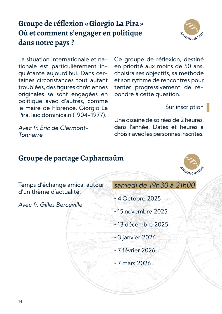 14Groupe de réflexion « Giorgio La Pira » Où et comment s’engager en politique dans notre pays ?La situation internationale et na-tionale est particulièrement in-quiétante aujourd’hui. Dans cer-taines circonstances tout autant troublées, des figures chrétiennes originales se sont engagées en politique avec d’autres, comme le maire de Florence, Giorgio La Pira, laïc dominicain (1904-1977). Avec fr. Eric de Clermont-TonnerreCe groupe de réflexion, destiné en priorité aux moins de 50 ans, choisira ses objectifs, sa méthode et son rythme de rencontres pour tenter progressivement de ré-pondre à cette question. Sur inscriptionUne dizaine de soirées de 2 heures, dans l’année. Dates et heures à choisir avec les personnes inscrites.Groupe de partage CapharnaümTemps d’échange amical autour d’un thème d’actualité.Avec fr. Gilles Bercevillesamedi de 19h30 à 21h00∙ 4 Octobre 2025∙ 15 novembre 2025∙ 13 décembre 2025∙ 3 janvier 2026∙ 7 février 2026∙ 7 mars 2026
