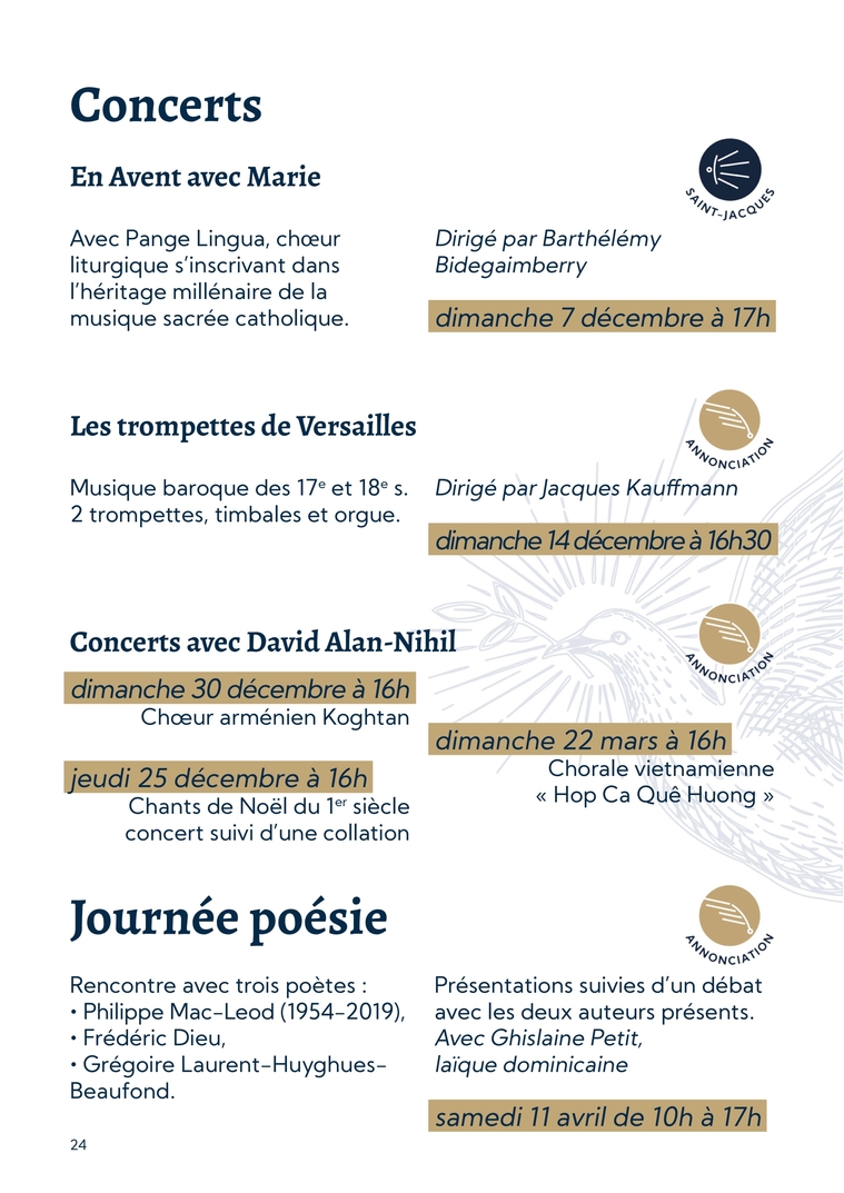 24Concertsdimanche 22 mars à 16hChorale vietnamienne « Hop Ca Quê Huong »dimanche 30 décembre à 16hChœur arménien Koghtan jeudi 25 décembre à 16hChants de Noël du 1er siècle concert suivi d’une collationConcerts avec David Alan-NihilAvec Pange Lingua, chœur liturgique s’inscrivant dans l’héritage millénaire de la musique sacrée catholique.Dirigé par Barthélémy Bidegaimberrydimanche 7 décembre à 17hEn Avent avec MarieJournée poésieRencontre avec trois poètes : ∙ Philippe Mac-Leod (1954-2019), ∙ Frédéric Dieu, ∙ Grégoire Laurent-Huyghues-Beaufond. Présentations suivies d’un débat avec les deux auteurs présents.Avec Ghislaine Petit, laïque dominicainesamedi 11 avril de 10h à 17hLes trompettes de VersaillesMusique baroque des 17e et 18e s. 2 trompettes, timbales et orgue. Dirigé par Jacques Kauffmanndimanche 14 décembre à 16h30