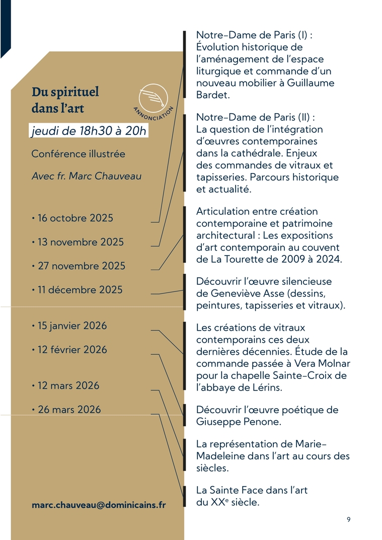 9jeudi de 18h30 à 20hConférence illustrée Avec fr. Marc Chauveaumarc.chauveau@dominicains.frDu spirituel dans l’art∙ 16 octobre 2025∙ 13 novembre 2025 ∙ 27 novembre 2025∙ 11 décembre 2025∙ 15 janvier 2026∙ 12 février 2026∙ 12 mars 2026∙ 26 mars 2026Notre-Dame de Paris (I) : Évolution historique de l’aménagement de l’espace liturgique et commande d’un nouveau mobilier à Guillaume Bardet.Notre-Dame de Paris (II) : La question de l’intégration d’œuvres contemporaines dans la cathédrale. Enjeux des commandes de vitraux et tapisseries. Parcours historique et actualité.Articulation entre création contemporaine et patrimoine architectural : Les expositions d’art contemporain au couvent de La Tourette de 2009 à 2024.Découvrir l’œuvre silencieuse de Geneviève Asse (dessins, peintures, tapisseries et vitraux).Les créations de vitraux contemporains ces deux dernières décennies. Étude de la commande passée à Vera Molnar pour la chapelle Sainte-Croix de l’abbaye de Lérins.Découvrir l’œuvre poétique de Giuseppe Penone.La représentation de Marie-Madeleine dans l’art au cours des siècles.La Sainte Face dans l’art du XXe siècle.