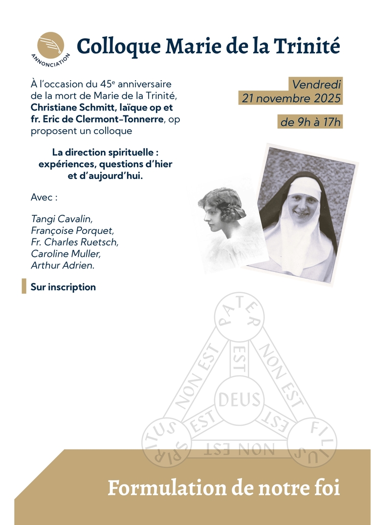 À l’occasion du 45e anniversaire de la mort de Marie de la Trinité, Christiane Schmitt, laïque op et fr. Eric de Clermont-Tonnerre, op proposent un colloque La direction spirituelle : expériences, questions d’hier et d’aujourd’hui.Avec : Tangi Cavalin, Françoise Porquet, Fr. Charles Ruetsch, Caroline Muller, Arthur Adrien.Sur inscriptionColloque Marie de la TrinitéVendredi 21 novembre 2025de 9h à 17hFormulation de notre foi