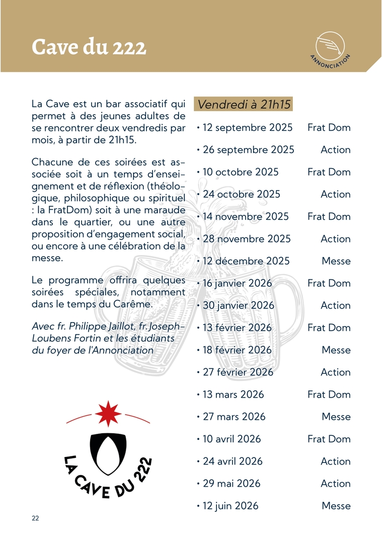 22Cave du 222Vendredi à 21h15∙ 12 septembre 2025 Frat Dom∙ 26 septembre 2025 Action∙ 10 octobre 2025 Frat Dom∙ 24 octobre 2025 Action∙ 14 novembre 2025 Frat Dom∙ 28 novembre 2025 Action∙ 12 décembre 2025 Messe∙ 16 janvier 2026 Frat Dom∙ 30 janvier 2026 Action∙ 13 février 2026 Frat Dom∙ 18 février 2026 Messe∙ 27 février 2026 Action∙ 13 mars 2026 Frat Dom∙ 27 mars 2026 Messe∙ 10 avril 2026 Frat Dom∙ 24 avril 2026 Action∙ 29 mai 2026 Action∙ 12 juin 2026 MesseLa Cave est un bar associatif qui permet à des jeunes adultes de se rencontrer deux vendredis par mois, à partir de 21h15. Chacune de ces soirées est as-sociée soit à un temps d’ensei-gnement et de réflexion (théolo-gique, philosophique ou spirituel : la FratDom) soit à une maraude dans le quartier, ou une autre proposition d’engagement social, ou encore à une célébration de la messe.Le programme offrira quelques soirées spéciales, notamment dans le temps du Carême.Avec fr. Philippe Jaillot, fr. Joseph-Loubens Fortin et les étudiants du foyer de l'Annonciation