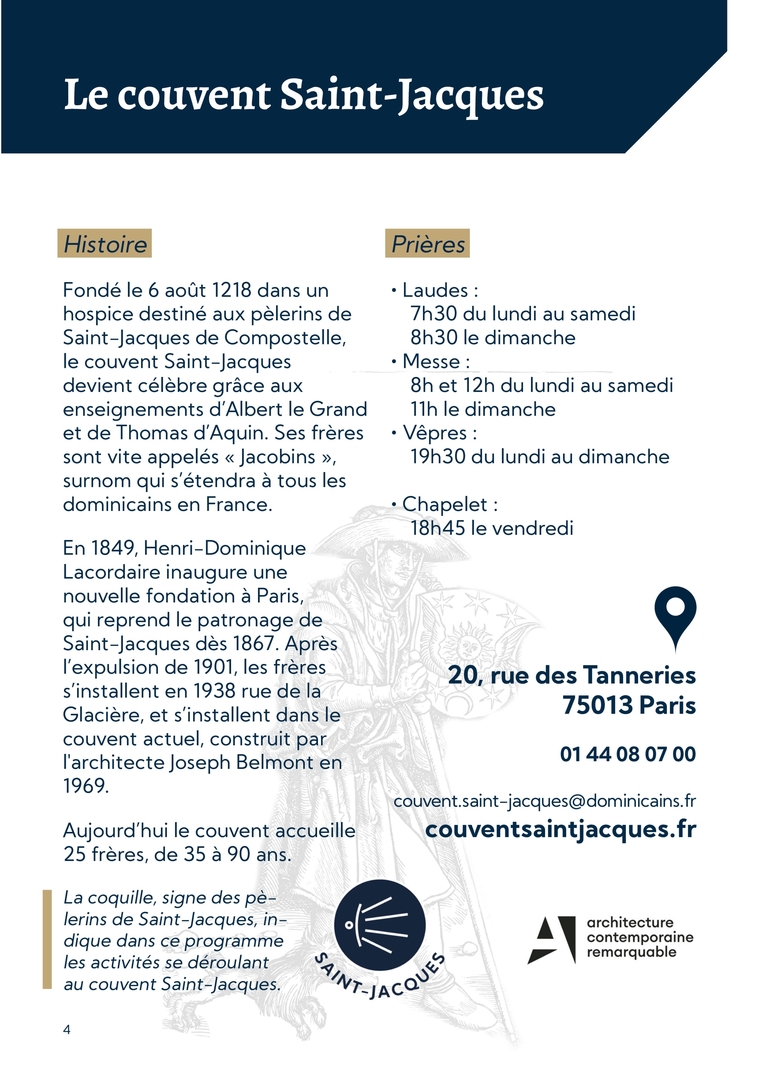 4Le couvent Saint-JacquesHistoireFondé le 6 août 1218 dans un hospice destiné aux pèlerins de Saint-Jacques de Compostelle, le couvent Saint-Jacques devient célèbre grâce aux enseignements d’Albert le Grand et de Thomas d’Aquin. Ses frères sont vite appelés « Jacobins », surnom qui s’étendra à tous les dominicains en France.En 1849, Henri-Dominique Lacordaire inaugure une nouvelle fondation à Paris, qui reprend le patronage de Saint-Jacques dès 1867. Après l’expulsion de 1901, les frères s’installent en 1938 rue de la Glacière, et s’installent dans le couvent actuel, construit par l'architecte Joseph Belmont en 1969.Aujourd’hui le couvent accueille 25 frères, de 35 à 90 ans.Prières∙ Laudes : 7h30 du lundi au samedi 8h30 le dimanche∙ Messe : 8h et 12h du lundi au samedi 11h le dimanche∙ Vêpres : 19h30 du lundi au dimanche∙ Chapelet : 18h45 le vendredi20, rue des Tanneries75013 Paris01 44 08 07 00couvent.saint-jacques@dominicains.frcouventsaintjacques.frLa coquille, signe des pè-lerins de Saint-Jacques, in-dique dans ce programme les activités se déroulant au couvent Saint-Jacques.
