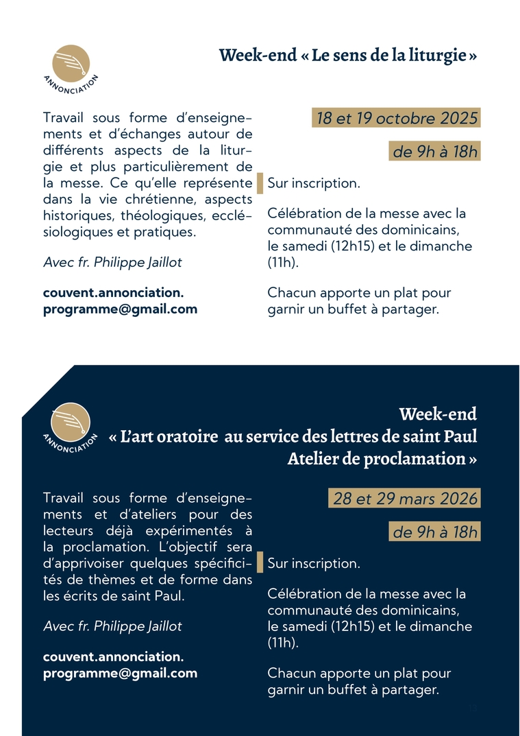 13Week-end « Le sens de la liturgie »Week-end « L’art oratoire au service des lettres de saint Paul Atelier de proclamation »Travail sous forme d’enseigne-ments et d’échanges autour de différents aspects de la litur-gie et plus particulièrement de la messe. Ce qu’elle représente dans la vie chrétienne, aspects historiques, théologiques, ecclé-siologiques et pratiques.Avec fr. Philippe Jaillotcouvent.annonciation.programme@gmail.comTravail sous forme d’enseigne-ments et d’ateliers pour des lecteurs déjà expérimentés à la proclamation. L’objectif sera d’apprivoiser quelques spécifici-tés de thèmes et de forme dans les écrits de saint Paul.Avec fr. Philippe Jaillotcouvent.annonciation.programme@gmail.com18 et 19 octobre 2025de 9h à 18hSur inscription.Célébration de la messe avec la communauté des dominicains, le samedi (12h15) et le dimanche (11h).Chacun apporte un plat pour garnir un buffet à partager.28 et 29 mars 2026de 9h à 18hSur inscription.Célébration de la messe avec la communauté des dominicains, le samedi (12h15) et le dimanche (11h).Chacun apporte un plat pour garnir un buffet à partager.