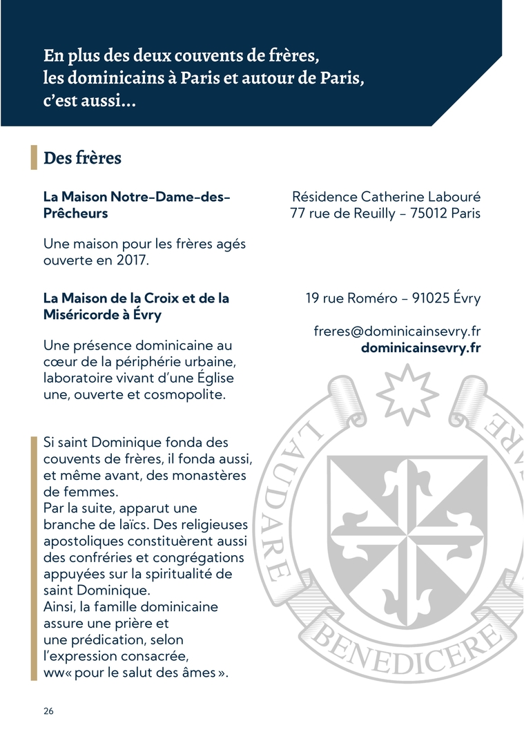 26En plus des deux couvents de frères, les dominicains à Paris et autour de Paris, c’est aussi...La Maison Notre-Dame-des-PrêcheursUne maison pour les frères agés ouverte en 2017.Résidence Catherine Labouré 77 rue de Reuilly - 75012 ParisLa Maison de la Croix et de la Miséricorde à ÉvryUne présence dominicaine au cœur de la périphérie urbaine, laboratoire vivant d’une Église une, ouverte et cosmopolite. 19 rue Roméro - 91025 Évry freres@dominicainsevry.fr dominicainsevry.frDes frèresSi saint Dominique fonda des couvents de frères, il fonda aussi, et même avant, des monastères de femmes. Par la suite, apparut une branche de laïcs. Des religieuses apostoliques constituèrent aussi des confréries et congrégations appuyées sur la spiritualité de saint Dominique. Ainsi, la famille dominicaine assure une prière et une prédication, selon l’expression consacrée, ww« pour le salut des âmes ».