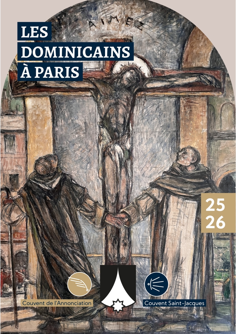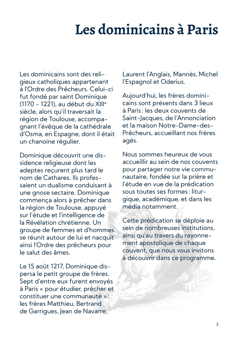 3Les dominicains à ParisLes dominicains sont des reli-gieux catholiques appartenant à l'Ordre des Prêcheurs. Celui-ci fut fondé par saint Dominique (1170 - 1221), au début du XIIIe siècle, alors qu’il traversait la région de Toulouse, accompa-gnant l’évêque de la cathédrale d’Osma, en Espagne, dont il était un chanoine régulier. Dominique découvrit une dis-sidence religieuse dont les adeptes reçurent plus tard le nom de Cathares. Ils profes-saient un dualisme conduisant à une gnose sectaire. Dominique commença alors à prêcher dans la région de Toulouse, appuyé sur l’étude et l'intelligence de la Révélation chrétienne. Un groupe de femmes et d'hommes se réunit autour de lui et nacquit ainsi l'Ordre des prêcheurs pour le salut des âmes.Le 15 août 1217, Dominique dis-persa le petit groupe de frères. Sept d’entre eux furent envoyés à Paris « pour étudier, prêcher et constituer une communauté » : les frères Matthieu, Bertrand de Garrigues, Jean de Navarre, Laurent l’Anglais, Mannès, Michel l’Espagnol et Oderius.Aujourd’hui, les frères domini-cains sont présents dans 3 lieux à Paris : les deux couvents de Saint-Jacques, de l’Annonciation et la maison Notre-Dame-des-Prêcheurs, accueillant nos frères agés.Nous sommes heureux de vous accueillir au sein de nos couvents pour partager notre vie commu-nautaire, fondée sur la prière et l’étude en vue de la prédication sous toutes ses formes : litur-gique, académique, et dans les média notamment. Cette prédication se déploie au sein de nombreuses institutions, ainsi qu’au travers du rayonne-ment apostolique de chaque couvent, que nous vous invitons à découvrir dans ce programme.