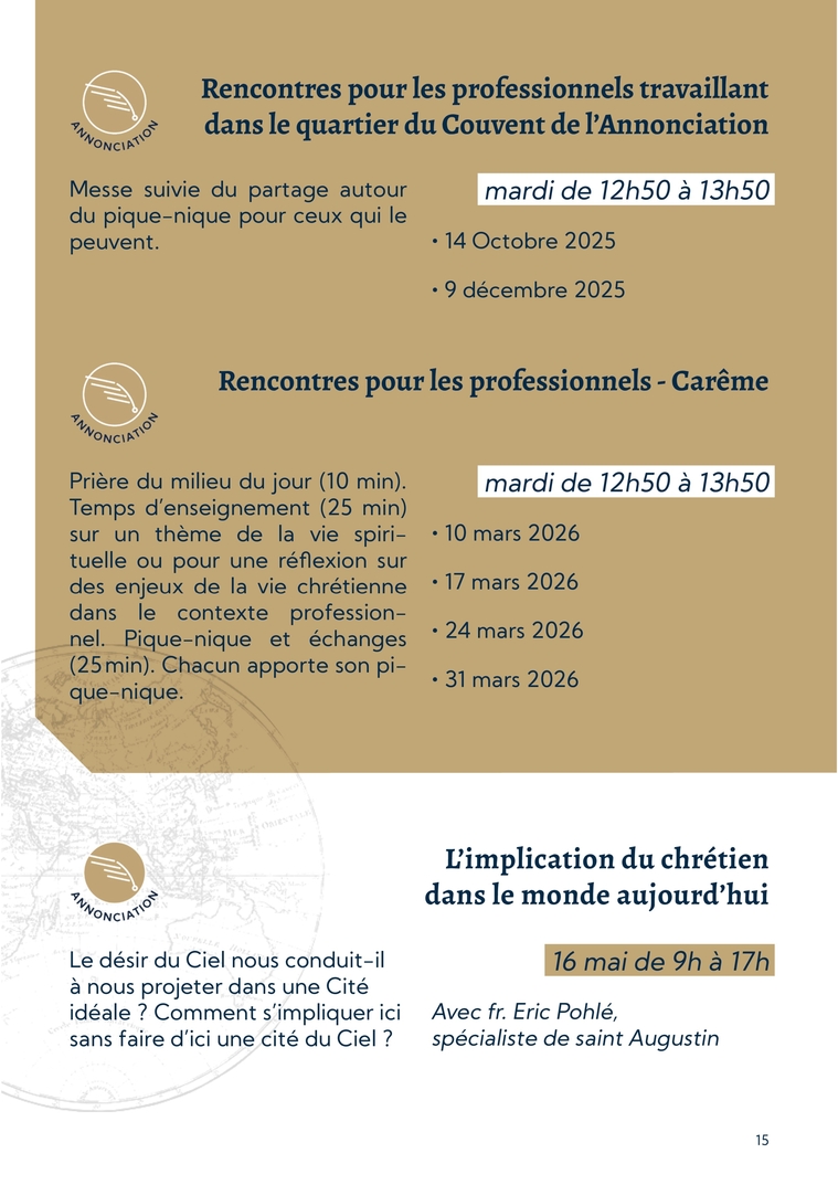 15Rencontres pour les professionnels travaillant dans le quartier du Couvent de l’AnnonciationRencontres pour les professionnels - CarêmeMesse suivie du partage autour du pique-nique pour ceux qui le peuvent. Prière du milieu du jour (10 min). Temps d’enseignement (25 min) sur un thème de la vie spiri-tuelle ou pour une réflexion sur des enjeux de la vie chrétienne dans le contexte profession-nel. Pique-nique et échanges (25 min). Chacun apporte son pi-que-nique.mardi de 12h50 à 13h50∙ 14 Octobre 2025∙ 9 décembre 2025mardi de 12h50 à 13h50∙ 10 mars 2026∙ 17 mars 2026∙ 24 mars 2026∙ 31 mars 2026Le désir du Ciel nous conduit-il à nous projeter dans une Cité idéale ? Comment s’impliquer ici sans faire d’ici une cité du Ciel ? L’implication du chrétien dans le monde aujourd’hui16 mai de 9h à 17hAvec fr. Eric Pohlé, spécialiste de saint Augustin