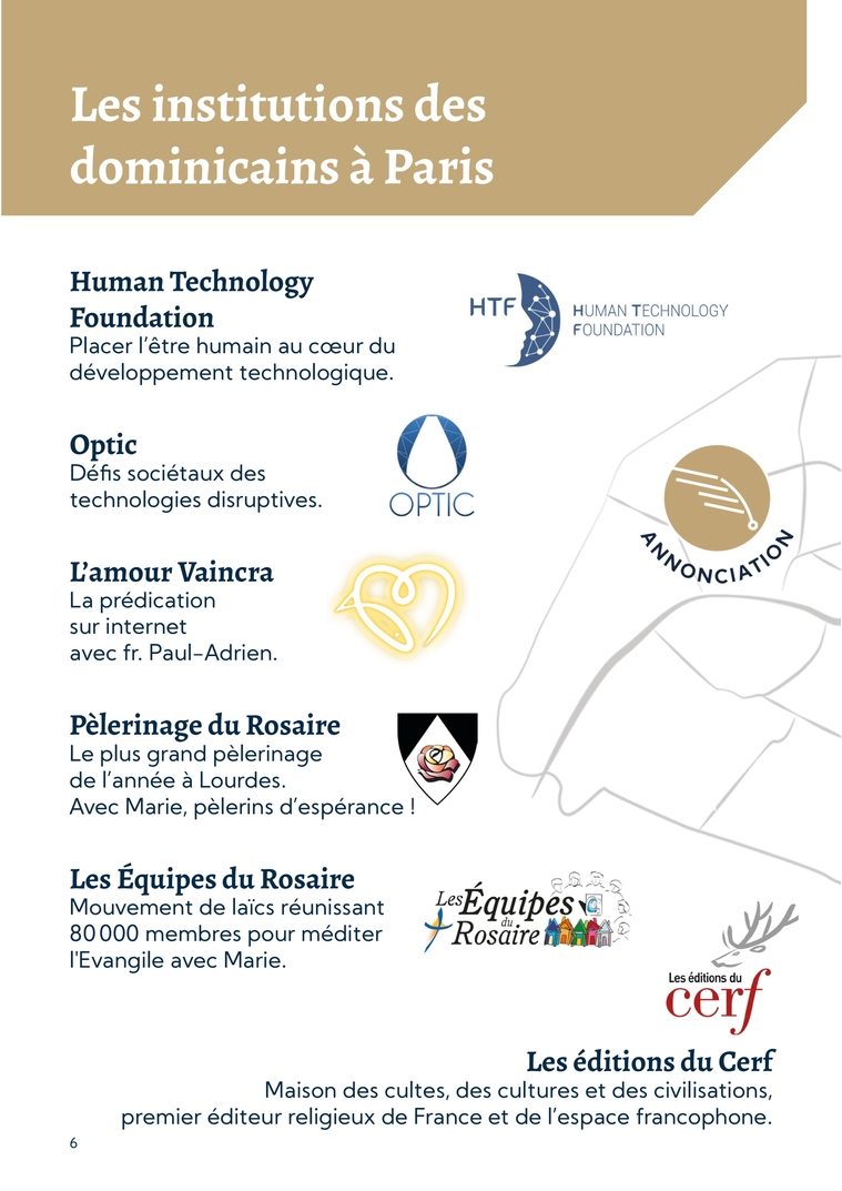 Les institutions des dominicains à Paris6L’amour Vaincra La prédication sur internet avec fr. Paul-Adrien.Optic Défis sociétaux des technologies disruptives.Human Technology Foundation Placer l’être humain au cœur du développement technologique.Pèlerinage du Rosaire Le plus grand pèlerinage de l’année à Lourdes. Avec Marie, pèlerins d’espérance !Les éditions du Cerf Maison des cultes, des cultures et des civilisations, premier éditeur religieux de France et de l’espace francophone.Les Équipes du Rosaire Mouvement de laïcs réunissant 80 000 membres pour méditer l'Evangile avec Marie.
