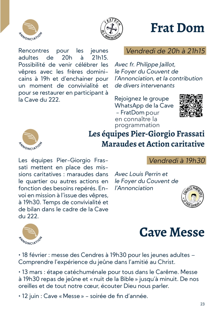 23Frat DomVendredi de 20h à 21h15Avec fr. Philippe Jaillot, le Foyer du Couvent de l’Annonciation, et la contribution de divers intervenantsRejoignez le groupe WhatsApp de la Cave - FratDom :Rencontres pour les jeunes adultes de 20h à 21h15. Possibilité de venir célébrer les vêpres avec les frères domini-cains à 19h et d’enchainer pour un moment de convivialité et pour se restaurer en participant à la Cave du 222.Les équipes Pier-Giorgio Frassati Maraudes et Action caritativeVendredi à 19h30Avec Louis Perrin et le Foyer du Couvent de l’AnnonciationLes équipes Pier-Giorgio Fras-sati mettent en place des mis-sions caritatives : maraudes dans le quartier ou autres actions en fonction des besoins repérés. En-voi en mission à l’issue des vêpres, à 19h30. Temps de convivialité et de bilan dans le cadre de la Cave du 222.Cave Messe∙ 18 février : messe des Cendres à 19h30 pour les jeunes adultes – Comprendre l’expérience du jeûne dans l’amitié au Christ.∙ 13 mars : étape catéchuménale pour tous dans le Carême. Messe à 19h30 repas de jeûne et « nuit de la Bible » jusqu’à minuit. De nos oreilles et de tout notre cœur, écouter Dieu nous parler.∙ 12 juin : Cave « Messe » - soirée de fin d’année.pouren connaître laprogrammation