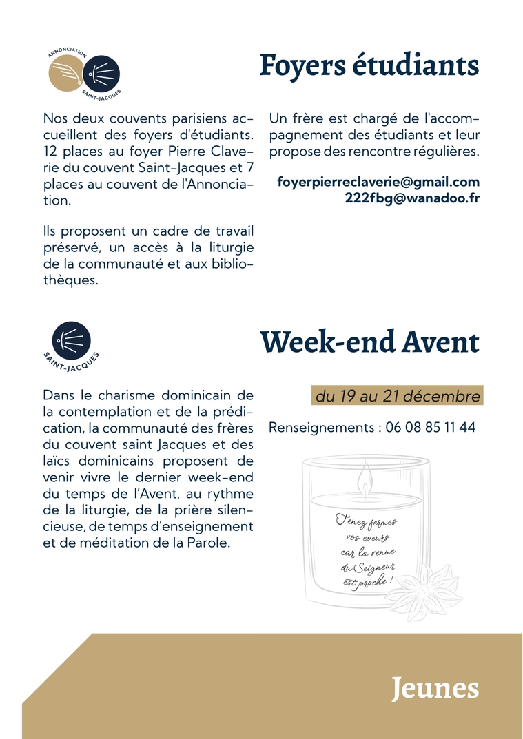 Week-end AventDans le charisme dominicain de la contemplation et de la prédi-cation, la communauté des frères du couvent saint Jacques et des laïcs dominicains proposent de venir vivre le dernier week-end du temps de l’Avent, au rythme de la liturgie, de la prière silen-cieuse, de temps d’enseignement et de méditation de la Parole.du 19 au 21 décembreRenseignements : 06 08 85 11 44JeunesFoyers étudiantsNos deux couvents parisiens ac-cueillent des foyers d'étudiants. 12 places au foyer Pierre Clave-rie du couvent Saint-Jacques et 7 places au couvent de l'Annoncia-tion.Ils proposent un cadre de travail préservé, un accès à la liturgie de la communauté et aux biblio-thèques.Un frère est chargé de l'accom-pagnement des étudiants et leur propose des rencontre régulières.foyerpierreclaverie@gmail.com 222fbg@wanadoo.fr