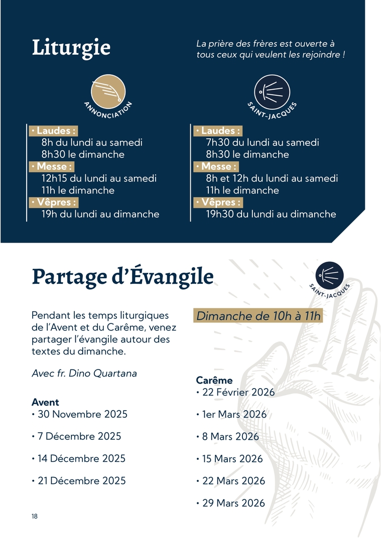 18Partage d’ÉvangileLiturgiePendant les temps liturgiques de l’Avent et du Carême, venez partager l’évangile autour des textes du dimanche.Avec fr. Dino Quartana∙ Laudes : 8h du lundi au samedi 8h30 le dimanche∙ Messe : 12h15 du lundi au samedi 11h le dimanche∙ Vêpres : 19h du lundi au dimancheDimanche de 10h à 11hAvent∙ 30 Novembre 2025∙ 7 Décembre 2025∙ 14 Décembre 2025∙ 21 Décembre 2025Carême∙ 22 Février 2026∙ 1er Mars 2026∙ 8 Mars 2026∙ 15 Mars 2026∙ 22 Mars 2026∙ 29 Mars 2026∙ Laudes : 7h30 du lundi au samedi 8h30 le dimanche∙ Messe : 8h et 12h du lundi au samedi 11h le dimanche∙ Vêpres : 19h30 du lundi au dimancheLa prière des frères est ouverte à tous ceux qui veulent les rejoindre !