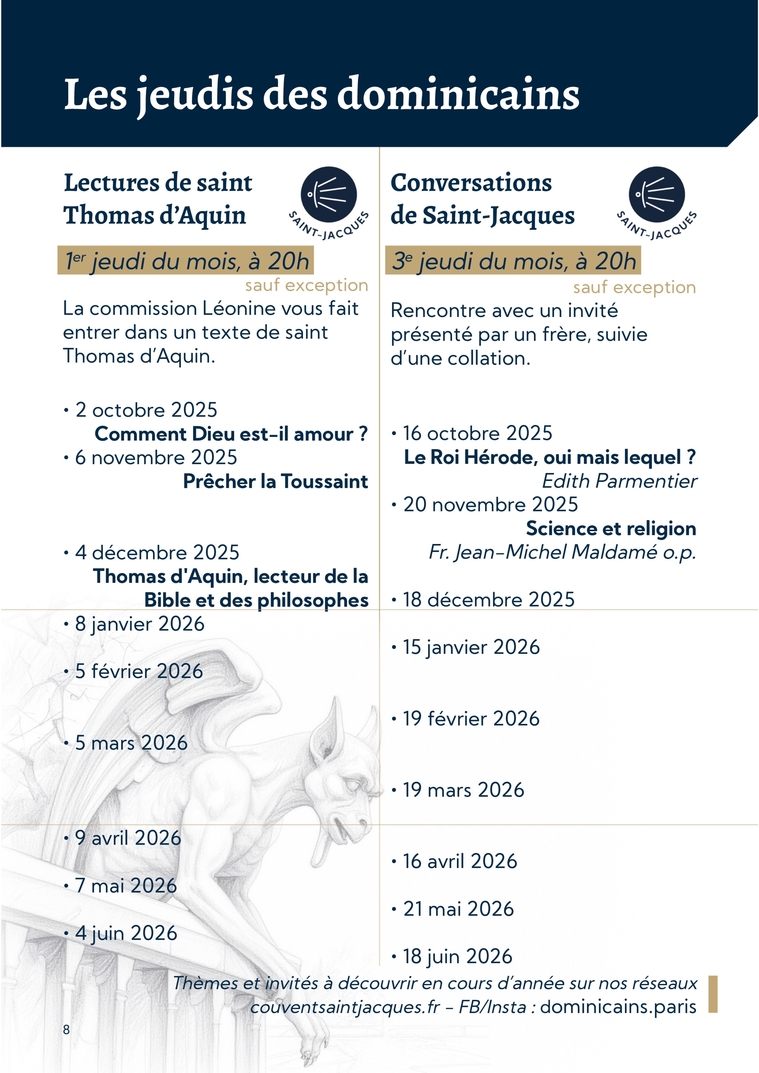 8Les jeudis des dominicains3e jeudi du mois, à 20hsauf exceptionRencontre avec un invité présenté par un frère, suivie d’une collation.1er jeudi du mois, à 20hsauf exceptionLa commission Léonine vous fait entrer dans un texte de saint Thomas d’Aquin.Conversations de Saint-JacquesLectures de saint Thomas d’Aquin∙ 16 octobre 2025Le Roi Hérode, oui mais lequel ? Edith Parmentier∙ 20 novembre 2025Science et religionFr. Jean-Michel Maldamé o.p.∙ 18 décembre 2025∙ 15 janvier 2026∙ 19 février 2026∙ 19 mars 2026∙ 16 avril 2026∙ 21 mai 2026∙ 18 juin 2026∙ 2 octobre 2025Comment Dieu est-il amour ?∙ 6 novembre 2025Prêcher la Toussaint∙ 4 décembre 2025Thomas d'Aquin, lecteur de la Bible et des philosophes∙ 8 janvier 2026∙ 5 février 2026∙ 5 mars 2026 ∙ 9 avril 2026 ∙ 7 mai 2026∙ 4 juin 2026Thèmes et invités à découvrir en cours d’année sur nos réseaux couventsaintjacques.fr - FB/Insta : dominicains.paris