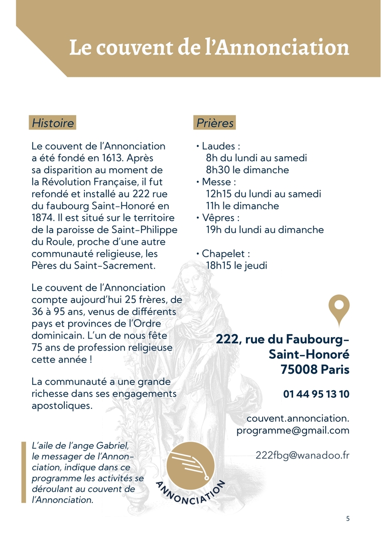 5Le couvent de l’AnnonciationL’aile de l’ange Gabriel, le messager de l’Annon-ciation, indique dans ce programme les activités se déroulant au couvent de l’Annonciation.HistoireLe couvent de l’Annonciation a été fondé en 1613. Après sa disparition au moment de la Révolution Française, il fut refondé et installé au 222 rue du faubourg Saint-Honoré en 1874. Il est situé sur le territoire de la paroisse de Saint-Philippe du Roule, proche d’une autre communauté religieuse, les Pères du Saint-Sacrement. Le couvent de l’Annonciation compte aujourd’hui 25 frères, de 36 à 95 ans, venus de différents pays et provinces de l’Ordre dominicain. L’un de nous fête 75 ans de profession religieuse cette année ! La communauté a une grande richesse dans ses engagements apostoliques. Prières∙ Laudes : 8h du lundi au samedi 8h30 le dimanche∙ Messe : 12h15 du lundi au samedi 11h le dimanche∙ Vêpres : 19h du lundi au dimanche∙ Chapelet : 18h15 le jeudi222, rue du Faubourg-Saint-Honoré 75008 Paris01 44 95 13 10couvent.annonciation.programme@gmail.com222fbg@wanadoo.fr