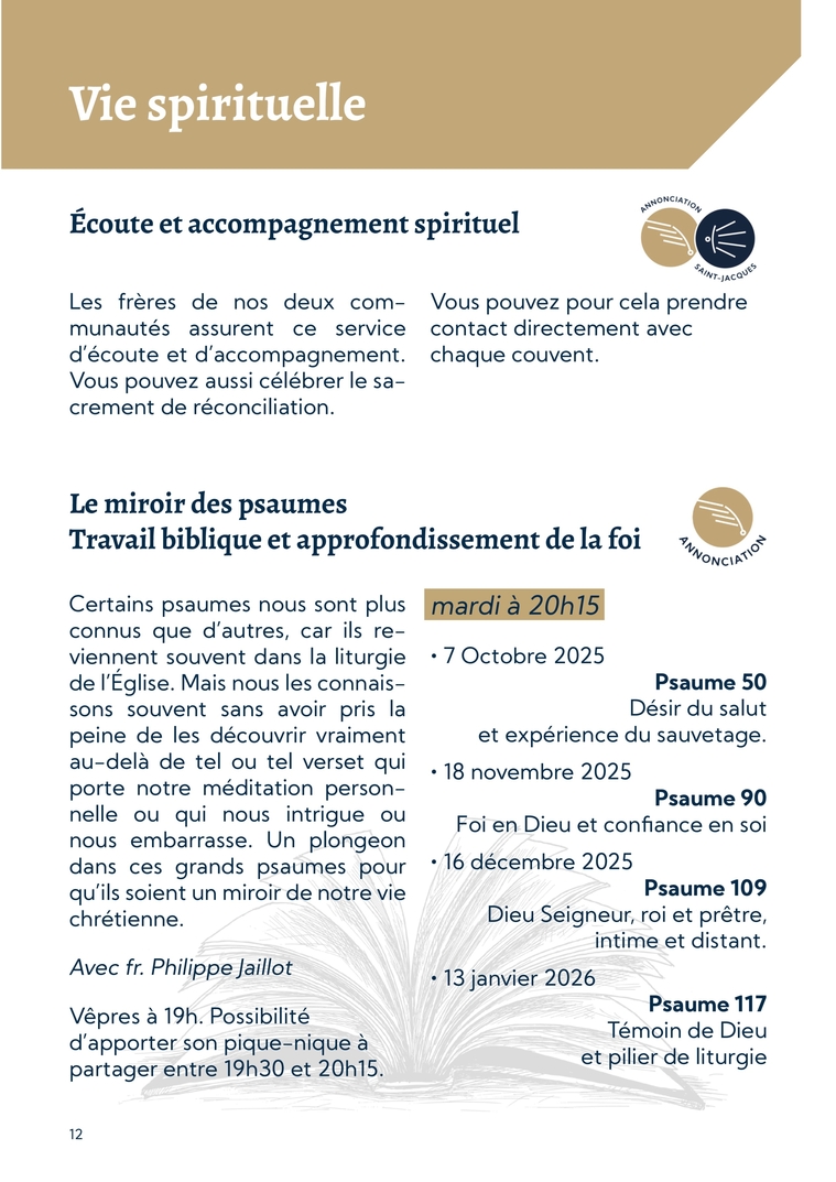 12Vie spirituelleLe miroir des psaumes Travail biblique et approfondissement de la foiCertains psaumes nous sont plus connus que d’autres, car ils re-viennent souvent dans la liturgie de l’Église. Mais nous les connais-sons souvent sans avoir pris la peine de les découvrir vraiment au-delà de tel ou tel verset qui porte notre méditation person-nelle ou qui nous intrigue ou nous embarrasse. Un plongeon dans ces grands psaumes pour qu’ils soient un miroir de notre vie chrétienne.Avec fr. Philippe JaillotVêpres à 19h. Possibilité d’apporter son pique-nique à partager entre 19h30 et 20h15.mardi à 20h15∙ 7 Octobre 2025Psaume 50 Désir du salut et expérience du sauvetage.∙ 18 novembre 2025Psaume 90 Foi en Dieu et confiance en soi∙ 16 décembre 2025Psaume 109 Dieu Seigneur, roi et prêtre, intime et distant.∙ 13 janvier 2026Psaume 117 Témoin de Dieu et pilier de liturgieÉcoute et accompagnement spirituelLes frères de nos deux com-munautés assurent ce service d’écoute et d’accompagnement. Vous pouvez aussi célébrer le sa-crement de réconciliation.Vous pouvez pour cela prendre contact directement avec chaque couvent.