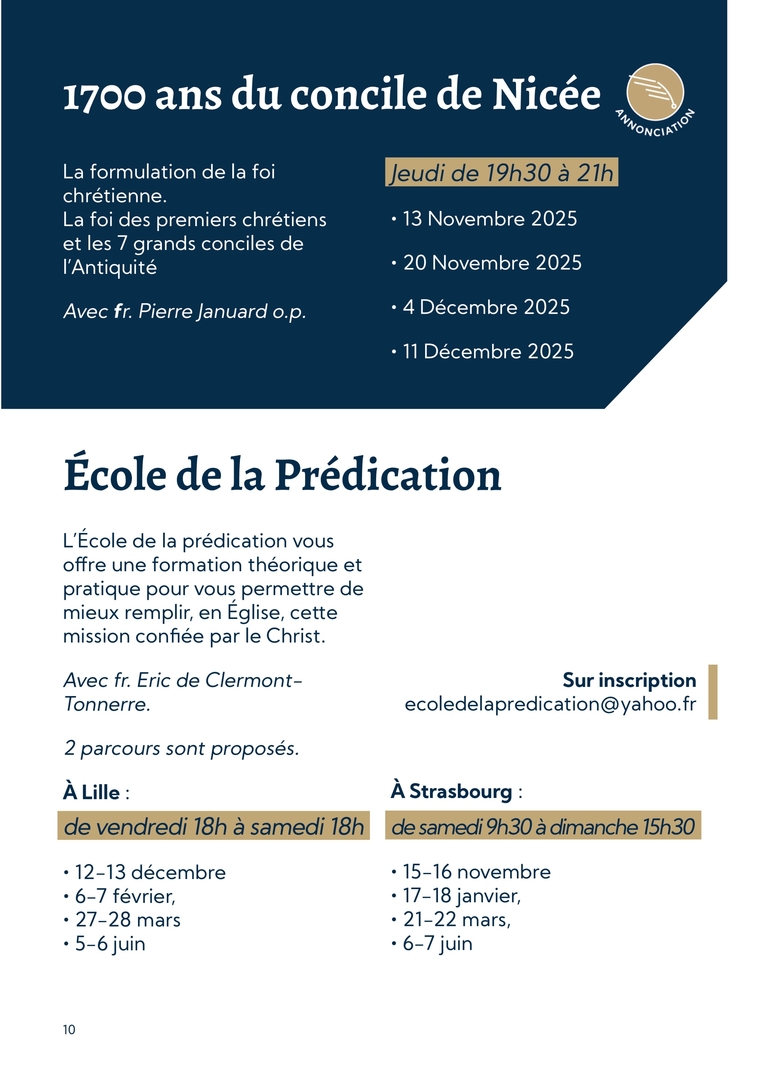 101700 ans du concile de NicéeLa formulation de la foi chrétienne. La foi des premiers chrétiens et les 7 grands conciles de l’AntiquitéAvec fr. Pierre Januard o.p.Jeudi de 19h30 à 21h∙ 13 Novembre 2025∙ 20 Novembre 2025∙ 4 Décembre 2025∙ 11 Décembre 2025École de la PrédicationL’École de la prédication vous offre une formation théorique et pratique pour vous permettre de mieux remplir, en Église, cette mission confiée par le Christ.Avec fr. Eric de Clermont-Tonnerre.2 parcours sont proposés.À Lille :de vendredi 18h à samedi 18h∙ 12-13 décembre ∙ 6-7 février, ∙ 27-28 mars ∙ 5-6 juinde samedi 9h30 à dimanche 15h30∙ 15-16 novembre ∙ 17-18 janvier, ∙ 21-22 mars, ∙ 6-7 juinÀ Strasbourg :Sur inscription ecoledelapredication@yahoo.fr