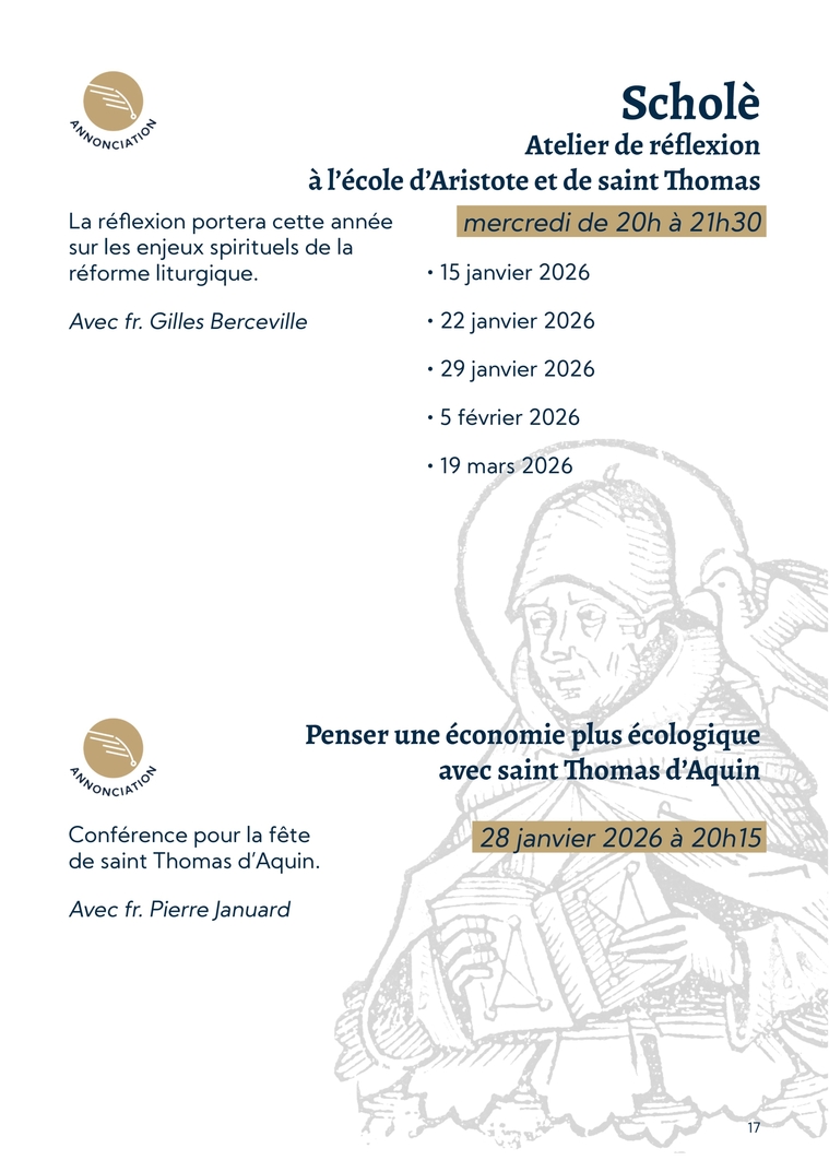 17ScholèAtelier de réflexion à l’école d’Aristote et de saint ThomasLa réflexion portera cette année sur les enjeux spirituels de la réforme liturgique.Avec fr. Gilles Bercevillemercredi de 20h à 21h30∙ 15 janvier 2026∙ 22 janvier 2026∙ 29 janvier 2026∙ 5 février 2026∙ 19 mars 2026Penser une économie plus écologique avec saint Thomas d’AquinConférence pour la fête de saint Thomas d’Aquin.Avec fr. Pierre Januard28 janvier 2026 à 20h15