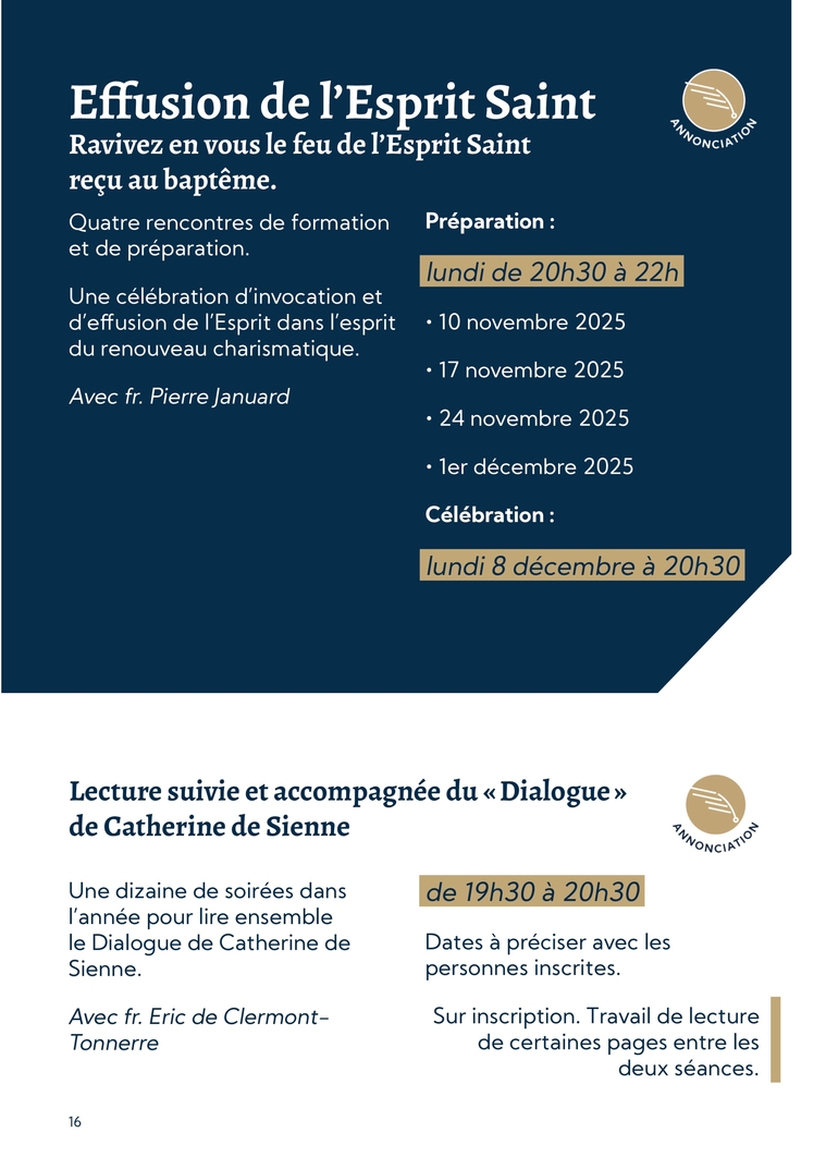 16Lecture suivie et accompagnée du « Dialogue » de Catherine de SienneUne dizaine de soirées dans l’année pour lire ensemble le Dialogue de Catherine de Sienne. Avec fr. Eric de Clermont-Tonnerrede 19h30 à 20h30Dates à préciser avec les personnes inscrites.Sur inscription. Travail de lecture de certaines pages entre les deux séances. Effusion de l’Esprit SaintRavivez en vous le feu de l’Esprit Saint reçu au baptême.Quatre rencontres de formation et de préparation.Une célébration d’invocation et d’effusion de l’Esprit dans l’esprit du renouveau charismatique.Avec fr. Pierre JanuardPréparation :lundi de 20h30 à 22h∙ 10 novembre 2025∙ 17 novembre 2025∙ 24 novembre 2025∙ 1er décembre 2025Célébration : lundi 8 décembre à 20h30