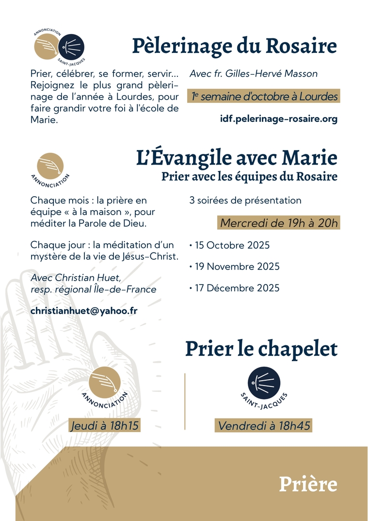 PrièreL’Évangile avec MariePrier avec les équipes du RosaireChaque mois : la prière en équipe « à la maison », pour méditer la Parole de Dieu.Chaque jour : la méditation d’un mystère de la vie de Jésus-Christ.Avec Christian Huet, resp. régional Île-de-Francechristianhuet@yahoo.fr3 soirées de présentationMercredi de 19h à 20h∙ 15 Octobre 2025∙ 19 Novembre 2025∙ 17 Décembre 2025Prier le chapeletJeudi à 18h15Vendredi à 18h45Pèlerinage du RosairePrier, célébrer, se former, servir... Rejoignez le plus grand pèleri-nage de l’année à Lourdes, pour faire grandir votre foi à l'école de Marie.Avec fr. Gilles-Hervé Masson1e semaine d'octobre à Lourdesidf.pelerinage-rosaire.org