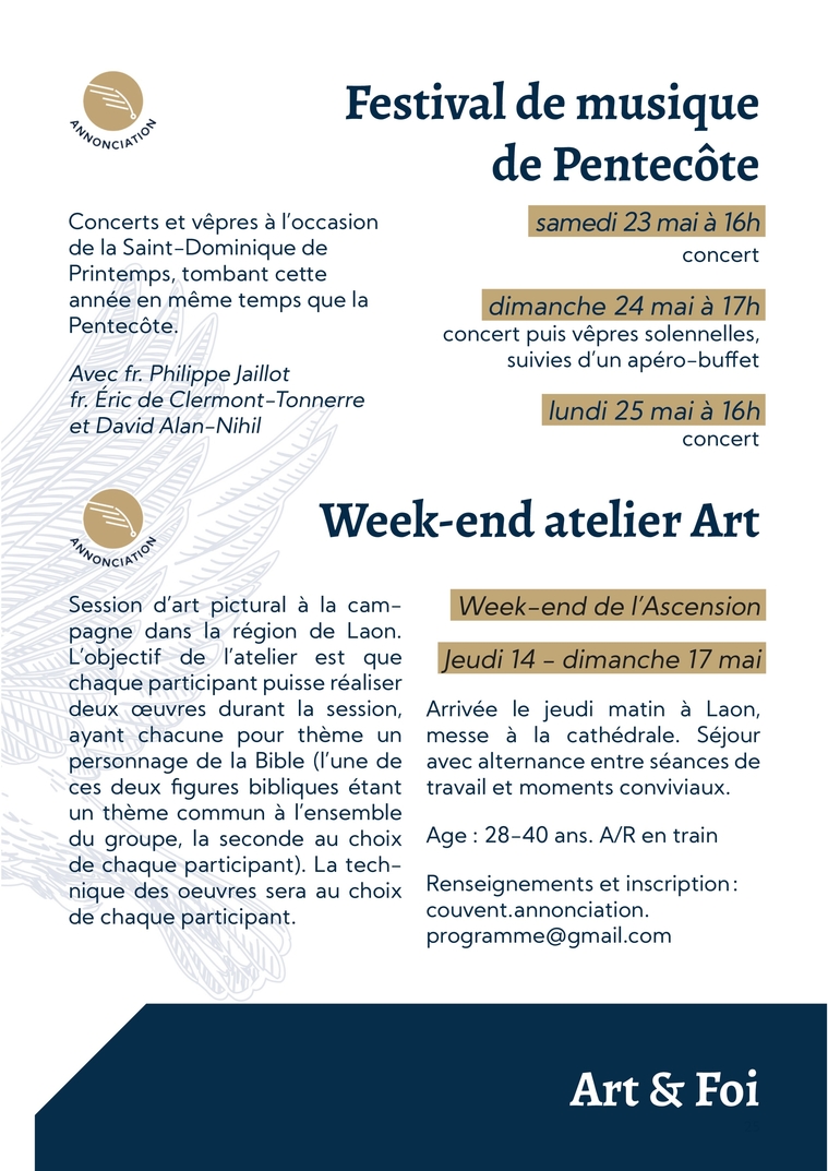 25Festival de musique de PentecôteConcerts et vêpres à l’occasion de la Saint-Dominique de Printemps, tombant cette année en même temps que la Pentecôte.Avec fr. Philippe Jaillot fr. Éric de Clermont-Tonnerre et David Alan-Nihilsamedi 23 mai à 16hconcertdimanche 24 mai à 17hconcert puis vêpres solennelles, suivies d’un apéro-buffetlundi 25 mai à 16hconcertArt & FoiWeek-end atelier ArtSession d’art pictural à la cam-pagne dans la région de Laon. L’objectif de l’atelier est que chaque participant puisse réaliser deux œuvres durant la session, ayant chacune pour thème un personnage de la Bible (l’une de ces deux figures bibliques étant un thème commun à l’ensemble du groupe, la seconde au choix de chaque participant). La tech-nique des oeuvres sera au choix de chaque participant. Week-end de l’AscensionJeudi 14 - dimanche 17 maiArrivée le jeudi matin à Laon, messe à la cathédrale. Séjour avec alternance entre séances de travail et moments conviviaux.Age : 28-40 ans. A/R en trainRenseignements et inscription : couvent.annonciation.programme@gmail.com