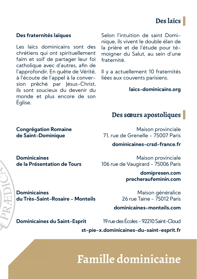 Famille dominicaine Des fraternités laïquesLes laïcs dominicains sont des chrétiens qui ont spirituellement faim et soif de partager leur foi catholique avec d’autres, afin de l’approfondir. En quête de Vérité, à l’écoute de l’appel à la conver-sion prêché par Jésus-Christ, ils sont soucieux du devenir du monde et plus encore de son Église.Selon l’intuition de saint Domi-nique, ils vivent le double élan de la prière et de l’étude pour té-moigner du Salut, au sein d’une fraternité.Il y a actuellement 10 fraternités liées aux couvents parisiens.laics-dominicains.orgCongrégation Romaine de Saint-DominiqueMaison provinciale 71, rue de Grenelle - 75007 Parisdominicaines-crsd-france.frDominicaines du Très-Saint-Rosaire - MonteilsMaison généralice 26 rue Taine - 75012 Parisdominicaines-monteils.comDominicaines du Saint-Esprit19 rue des Écoles - 92210 Saint-Cloudst-pie-x.dominicaines-du-saint-esprit.frDes laïcsDes sœurs apostoliquesDominicaines de la Présentation de ToursMaison provinciale 106 rue de Vaugirard - 75006 Parisdomipresen.com precheraufeminin.com