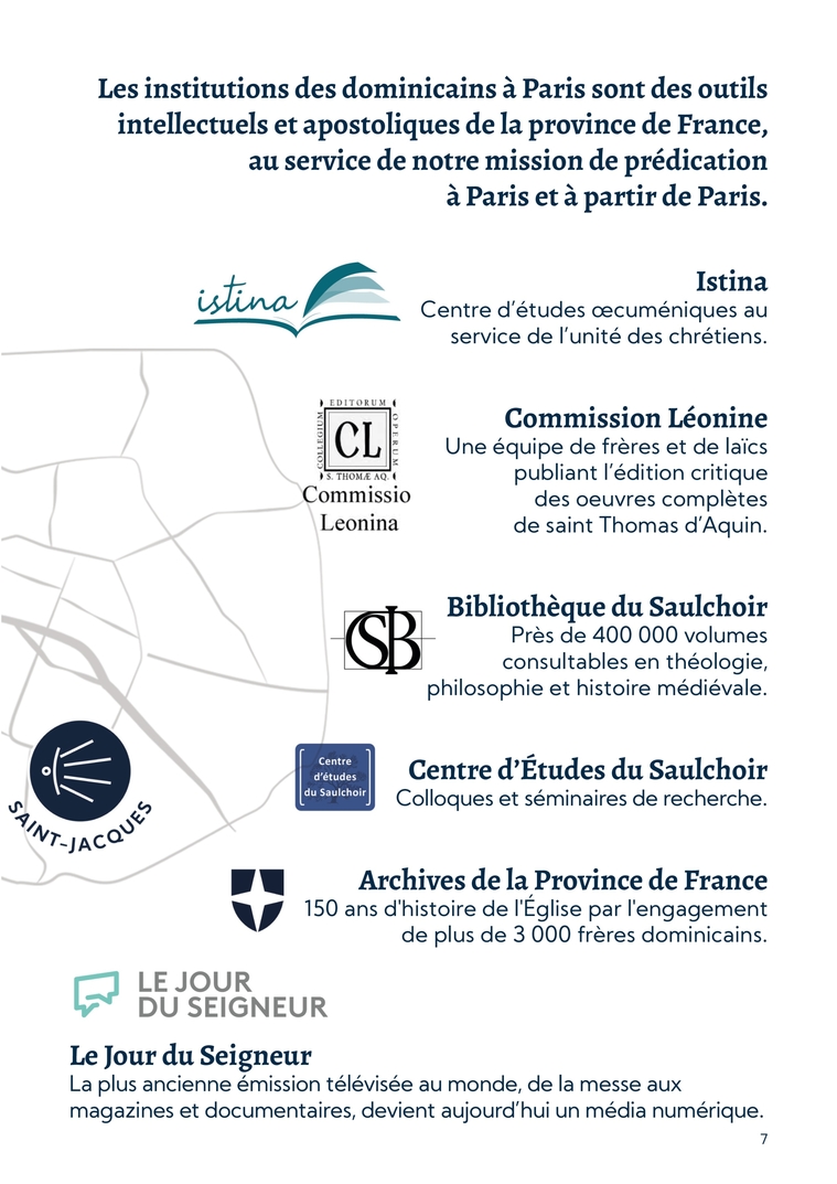 7Le Jour du Seigneur La plus ancienne émission télévisée au monde, de la messe aux magazines et documentaires, devient aujourd’hui un média numérique.Bibliothèque du Saulchoir Près de 400 000 volumes consultables en théologie, philosophie et histoire médiévale.Istina Centre d’études œcuméniques au service de l’unité des chrétiens.Commission Léonine Une équipe de frères et de laïcs publiant l’édition critique des oeuvres complètes de saint Thomas d’Aquin.Les institutions des dominicains à Paris sont des outils intellectuels et apostoliques de la province de France, au service de notre mission de prédication à Paris et à partir de Paris.Centre d’Études du Saulchoir Colloques et séminaires de recherche.Archives de la Province de France 150 ans d'histoire de l'Église par l'engagement de plus de 3 000 frères dominicains.